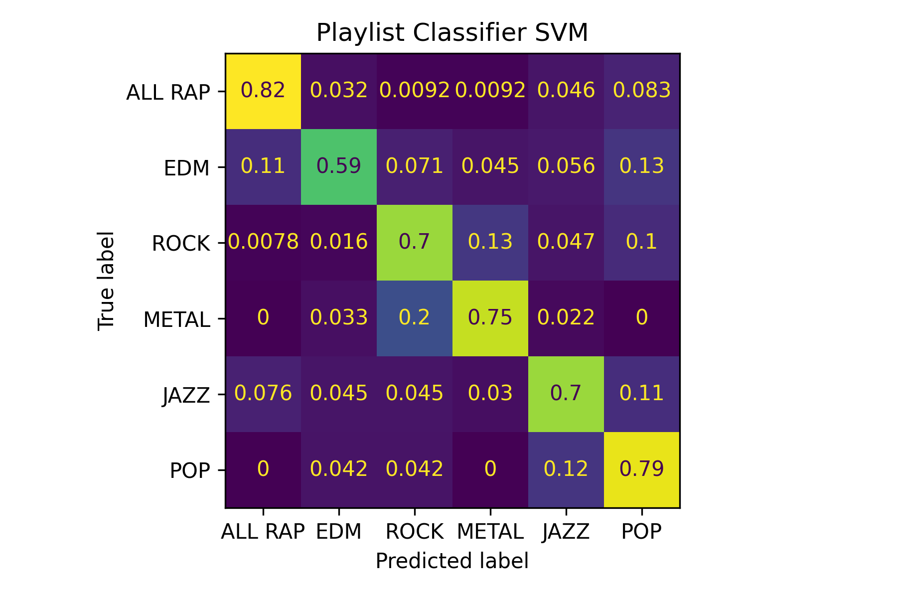 Spotify provides audio features for the tracks on its platform. These features describe a number of qualities for the tracks including how much energy it has and how vocal it is. I investigated whether the set of audio features for my larger genre playlists could be used to classify tracks by genre.